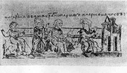 Основание Киева тремя братьями. Миниатюра из Радзивилловской летописи. 15 в.